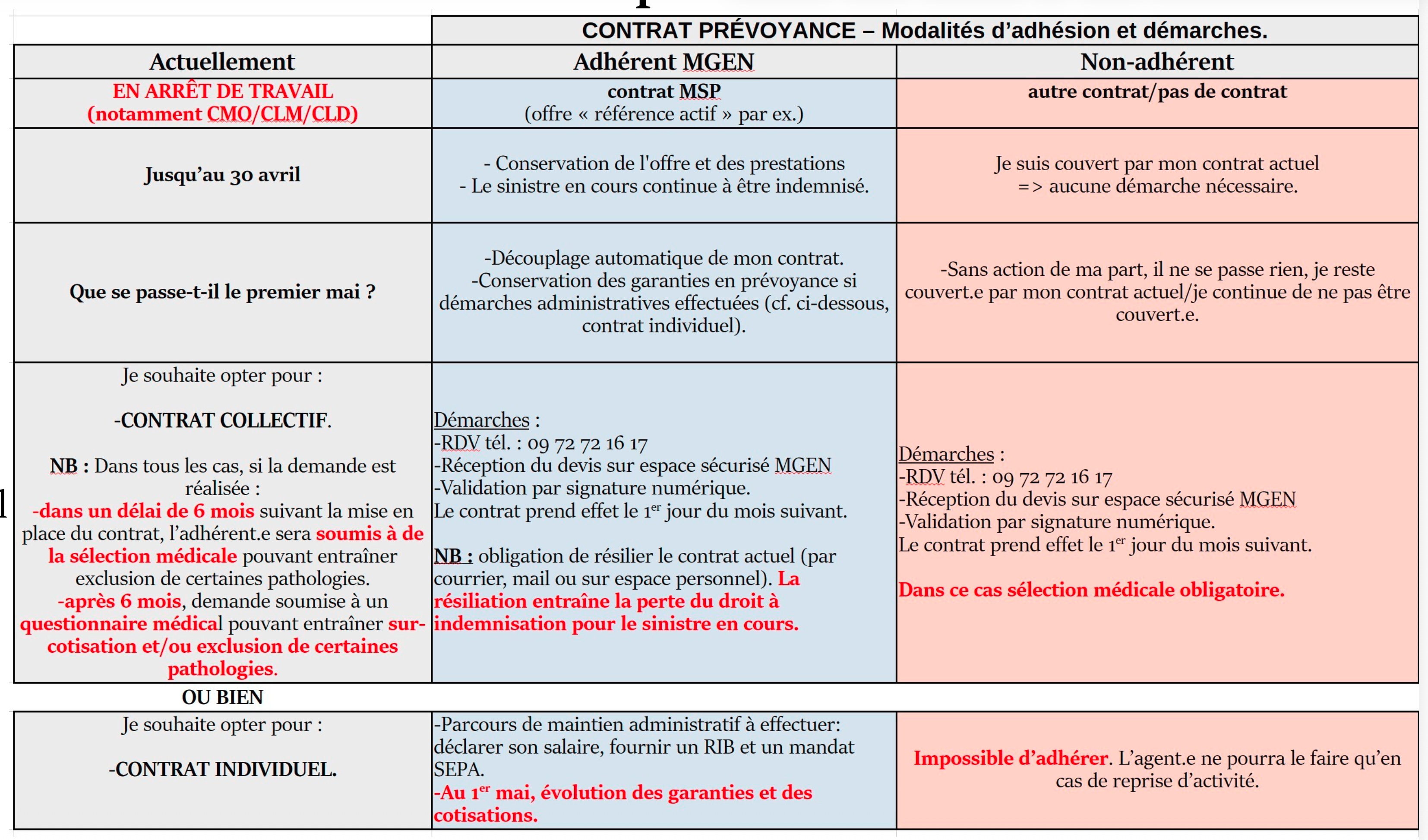 -La FSU dénonce : Les agent.es en arrêt doivent garder leur contrat actuel pour continuer à être indemnisé.e. Après 30 jours de reprise, possibilité de souscrire au contrat collectif mais avec questionnaire médical et sur-tarification possible. Nous réclamons une équité de traitement pour ces personnels.